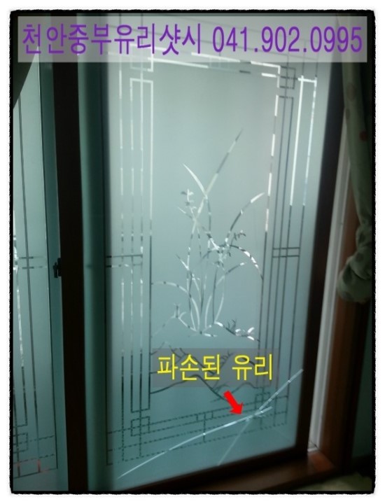 거실에서 베란다 중간창 에칭복층유리가 파손되었네요.