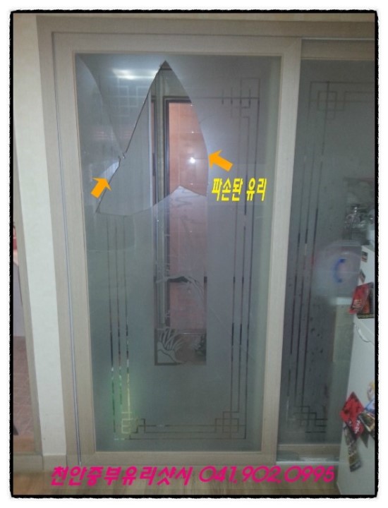 원룸유리는 대부분 이렇게 에칭으로 되어있습니다. 위험하게 파손되었네요.