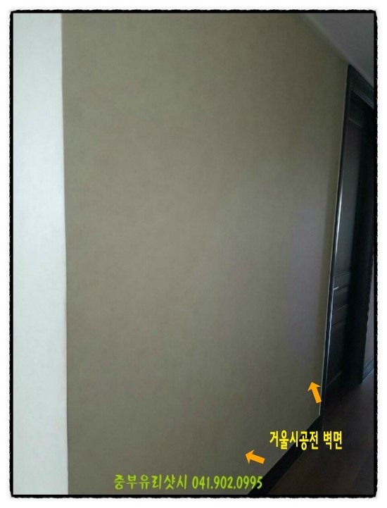 현관입구 벽면입니다. 어두어진 벽면이 이제 거울 설치후 완전히 달라집니다.