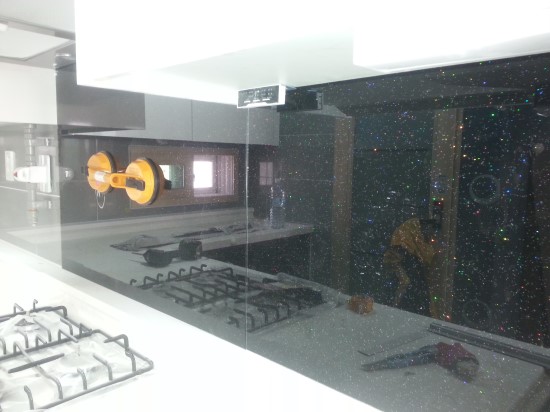 기존 타일에  검정색 펄 유리을 시공하고 있습니다.