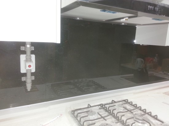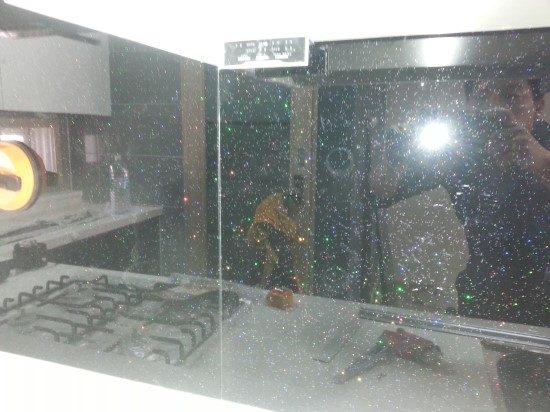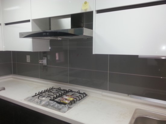 아파트 주방 기본 타일 앞쪽에 칼라유리타일 공사 사진입니다.